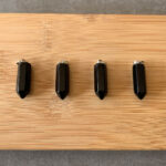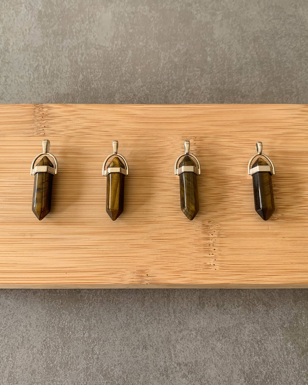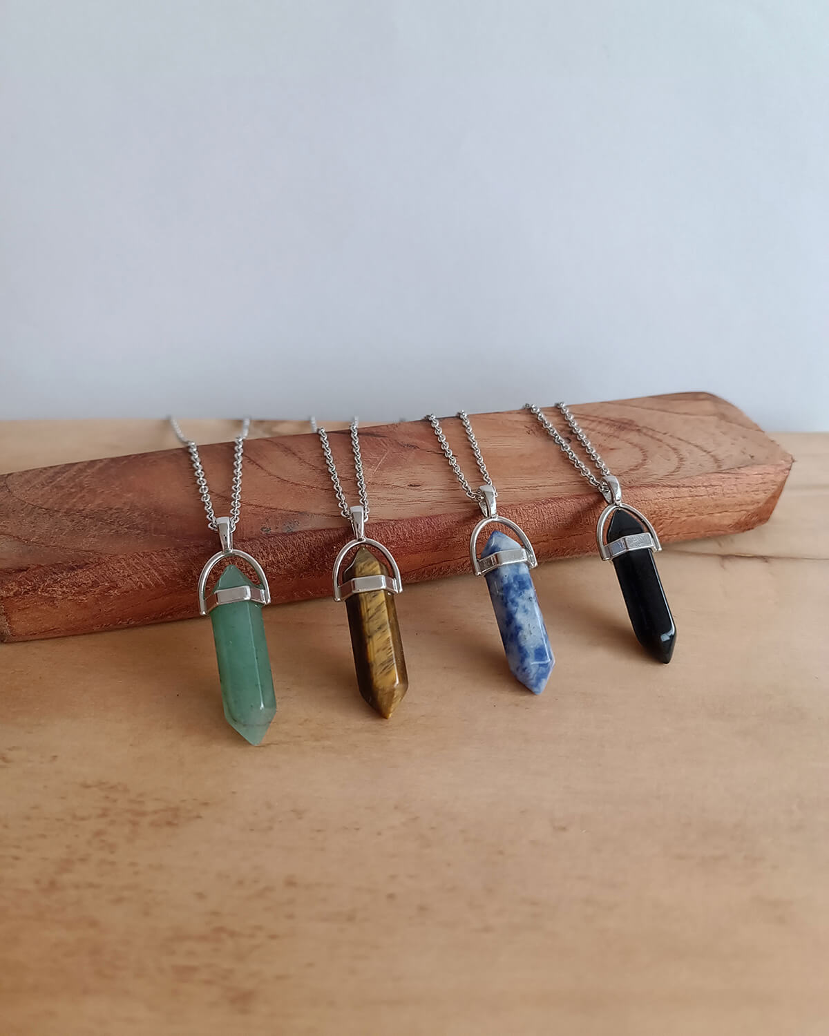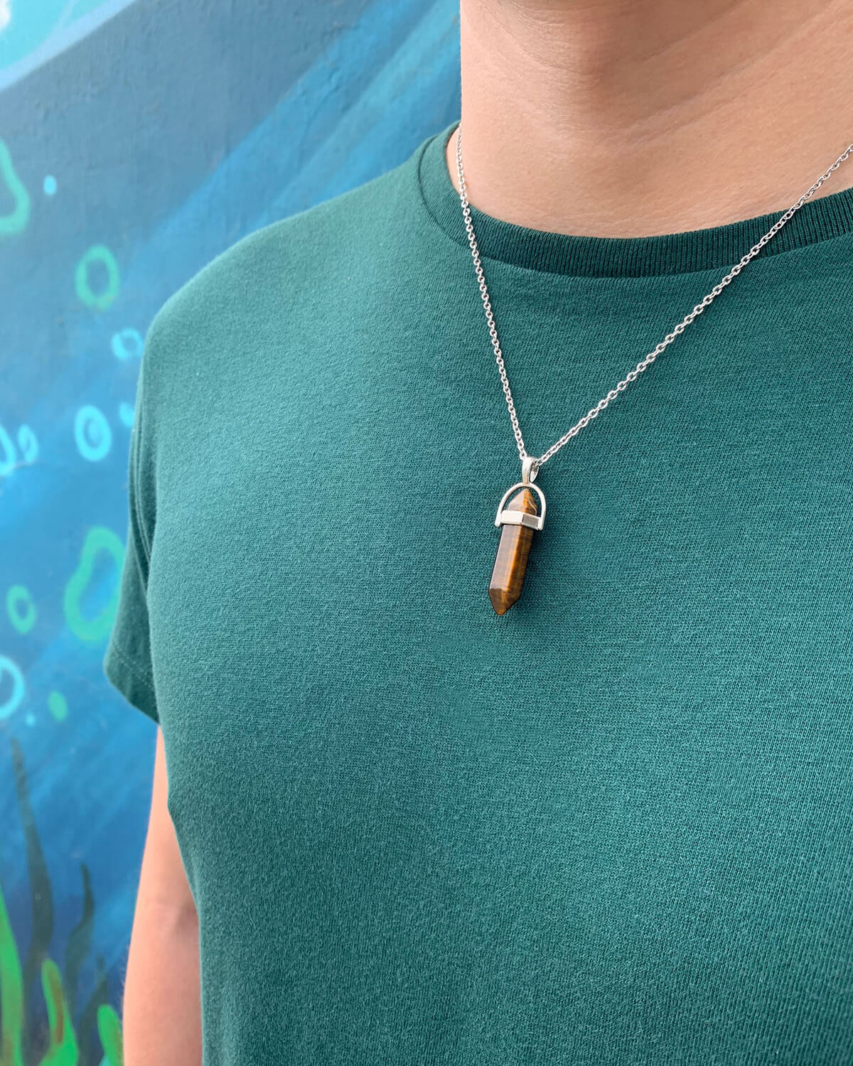 Collar con dije de piedra ojo de tigre de doble punta y cadena de acero inoxidable de 50 cm.
